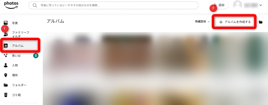 左のメニューから「アルバム」を選択肢、[アルバムを作成する]をクリックで作成できます。
